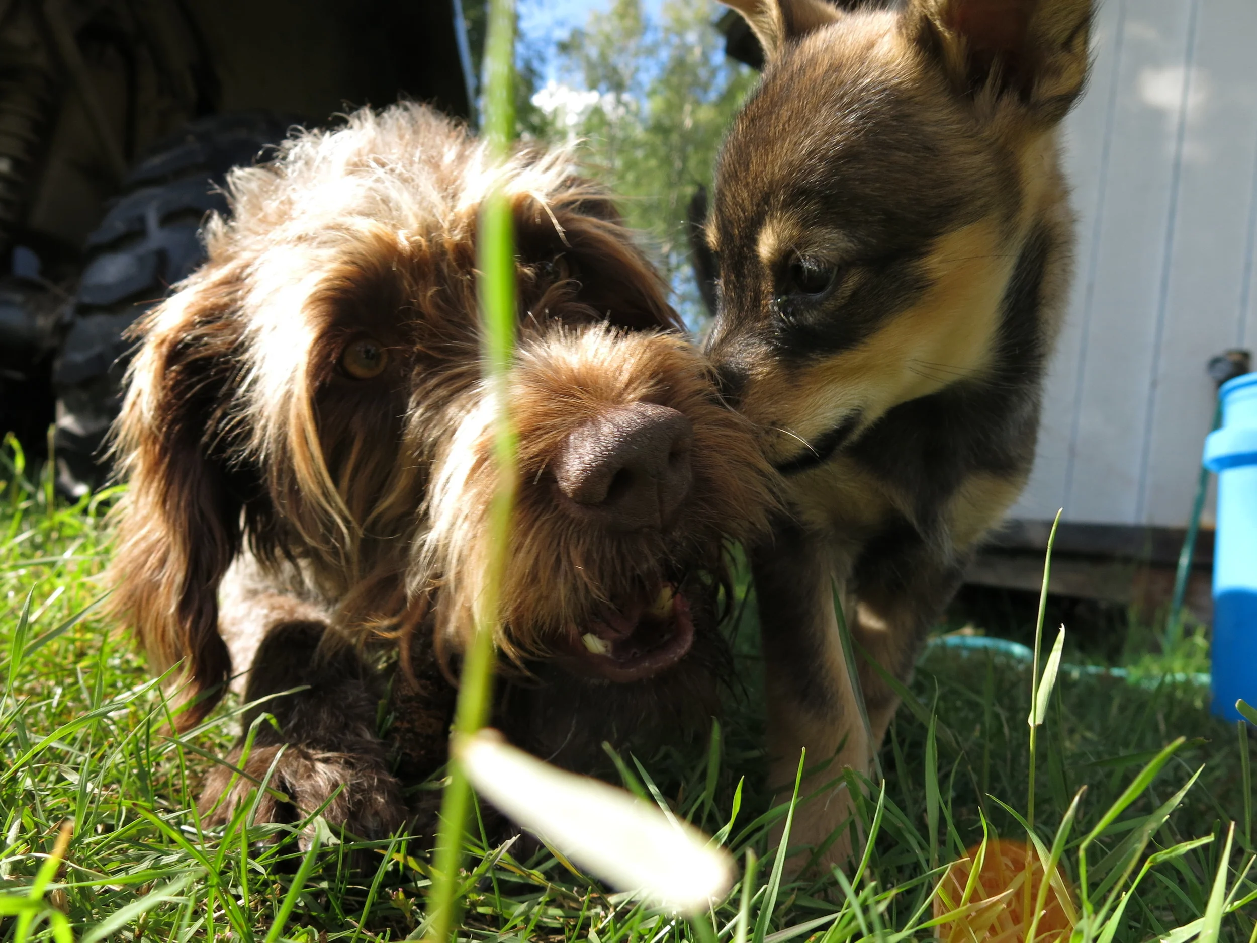 This is Feniks. She just arrived yesterday and is already making herself right at home stealing Jezzy's sticks and chewing on Stormy's tail.