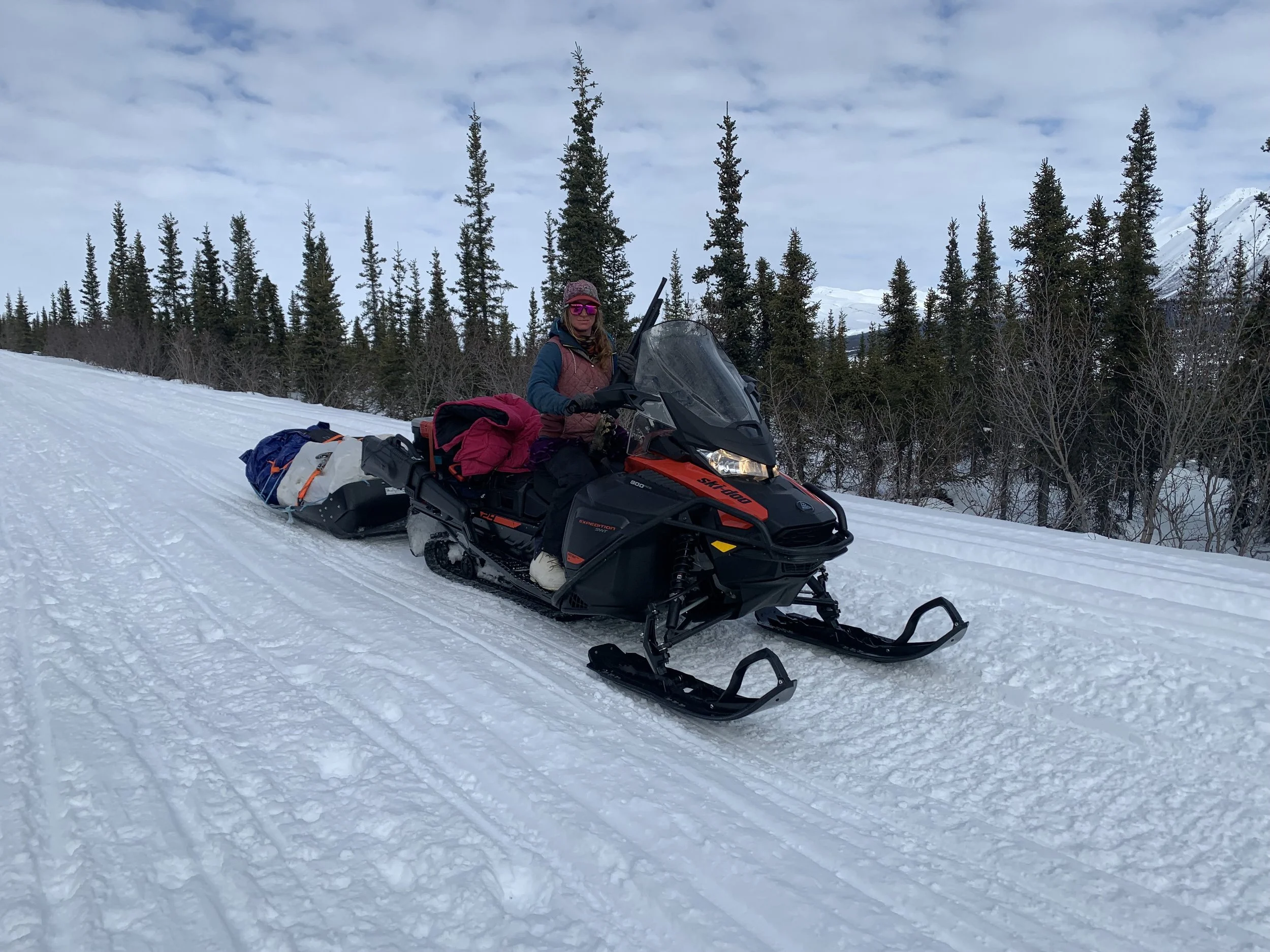 One fun story from the trips occurred during the first week. Moose have been very confrontational this winter due to the deep snow and challenging conditions. As a safety precaution, we had two guides (May Rose and Mollie) on snowmachines to travel in front and be a moose buffer. While the moose have been known to charge snowmachines, they especially hate dog teams, associating the dogs with wolves. Rather than running off the trail into the deep snow (where a wolf would have an advantage) the moose will hold their ground on the trail and run through a team if they feel too threatened. Sure enough, we encountered a particularly ornery moose the second day. Armed with an airhorn and firearms, May and Paige on snowmachines (Mollie was running Paige’s dog team) formed a buffer, gently encouraging a cow moose to not come our direction but instead take a trail off the main highway. Two snowmachiners came from the opposite direction, pinning the poor moose between our group and the arriving snowmachines. The moose turned and ran back towards us, but a warning blast from the airhorn and a warning shot in the air convinced the moose to keep her distance. The two snowmachiners who were traveling in the opposite direction motored off the highway and looped around the moose so that the moose was no longer sandwiched. She was still stressed and confused, so we waited for her to consider all her options and hopefully make the right decision. In the meantime, another family on snowmachines came up behind us. They passed our dog teams and pulled up next to May and Paige. Picture this, seven teams of five dogs. Two snowmachines staggered defensively at the front. May Rose, wearing a pink tutu and pink parka, a shotgun propped on her thigh as she eyed a grumpy moose. A grumpy moose, staring us down, trying to decide what it should do. The snowmachiner inquired about the situation and considered his options. His group didn’t have snowmachines that could easily go off trail (the snow was very deep), but they also admitted that they had no protection against moose either. Upon hearing this information, May, in her pink tutu and pink parka, shotgun propped on her thigh looks at the guy and goes- “you don’t have a gun?” I’d wager he’ll have that image stuck in his brain for years to come!